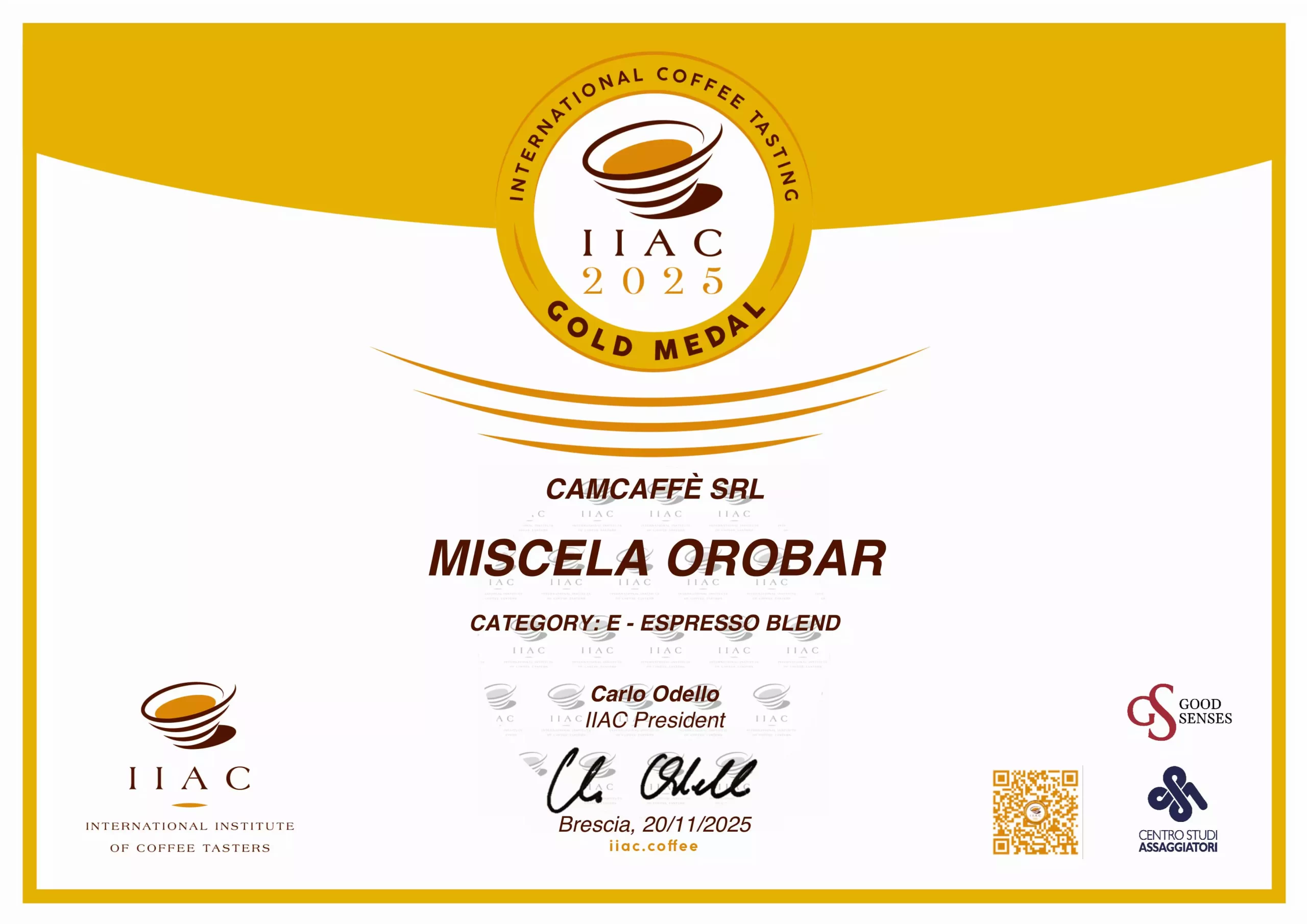 Campetelli’s Orobar Blend wins the Gold Medal 2025 at theInternational Coffee Tasting (ICT) of theIIAC – International Institute of Coffee Tasters. An award that recognizes balance, sensory cleanliness and consistency in the cup, obtained at the end of three days of blind evaluations on products of different categories and origins.