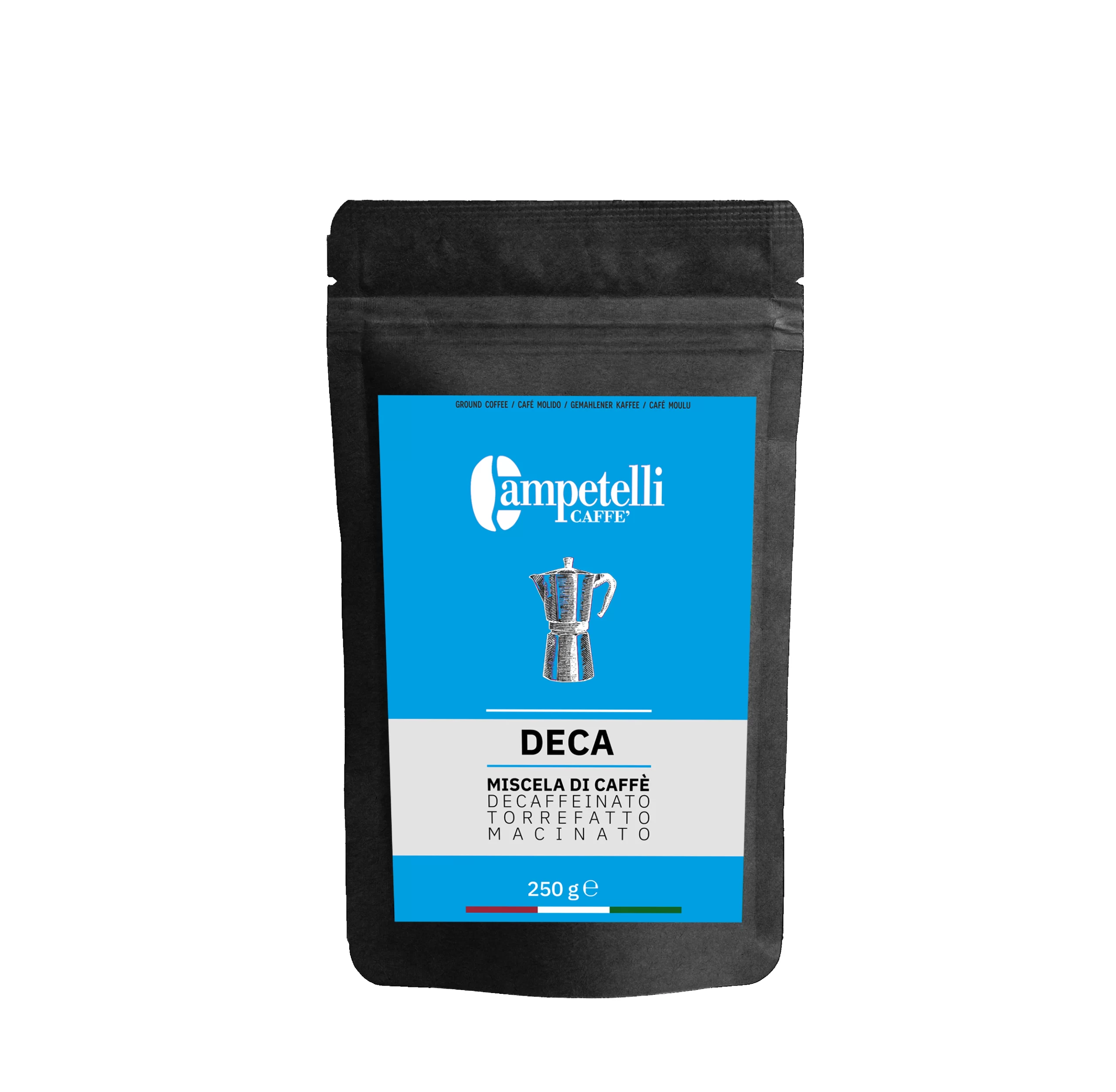 Speciale miscela di caffè decaffeinato in busta per moka, un gusto raffinato 65% Arabica e 35% Robusta selezionati, dal buon corpo e con note aromatiche di cioccolato, mandorla e nocciola. Con un tenore di caffeina non superiore allo 0,10% (D.M. 20.5.1976).
